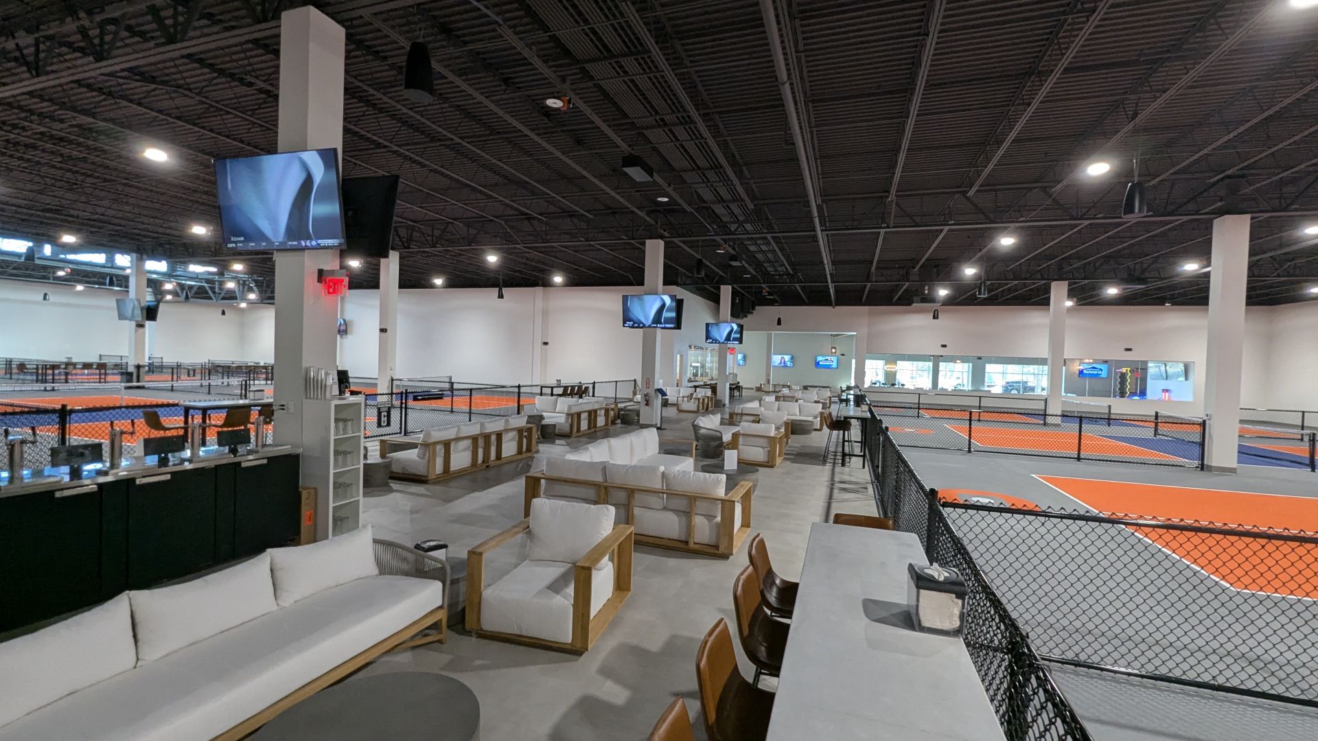- Overlooks the pickleball courts with lounge-style seating.