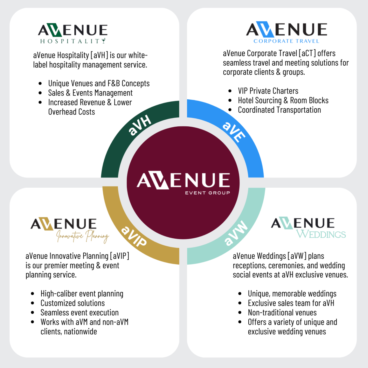 - aVenue Innovative Planning (aVIP): Our corporate event and meeting planning division, delivering tailored experiences that go beyond the ordinary. From large-scale conferences and incentive programs to brand activations and executive retreats, we create impactful events that leave lasting impressions.